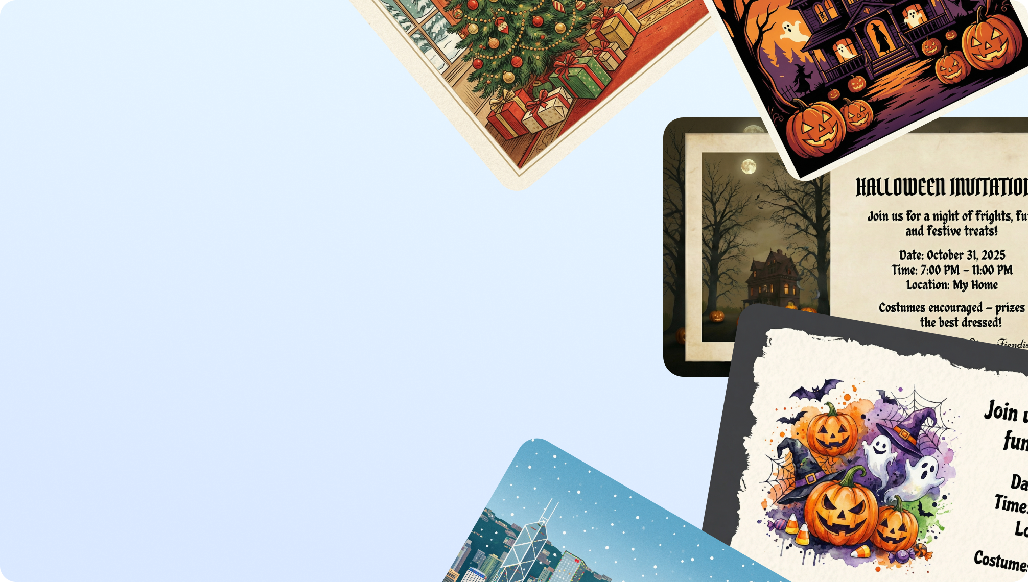Powered by Nano Banana Pro, GPT Image 1.5, Wan 2.5 Image, Image 4, Flux 1.1 Pro Ultra, and Flux Kontext Max, our AI postcard tool allows you to effortlessly create beautiful postcards for Christmas, New Year, Halloween, Father's Day, Thanksgiving, Valentine's Day, and many other occasions—all with just a single prompt.