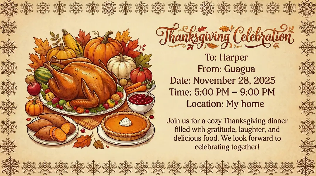 Powered by Nano Banana Pro, GPT Image 1.5, Wan 2.5 Image, Imagen 4, Flux 1.1 Pro Ultra, and Flux Kontext Max, il nostro tool AI per cartoline ti permette di creare facilmente bellissime cartoline per Natale, Capodanno, Halloween, Festa del Papà, Ringraziamento, San Valentino e molte altre occasioni—tutto con un solo prompt.